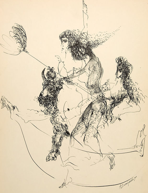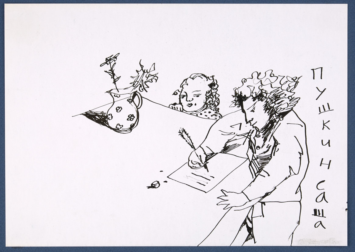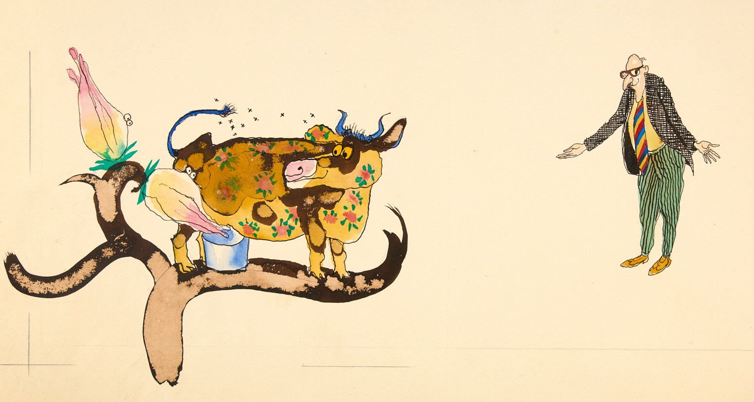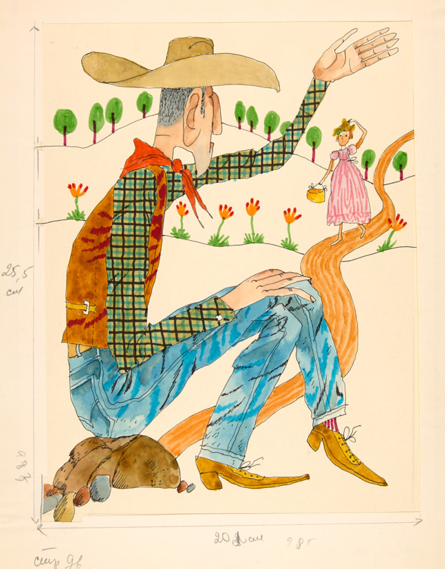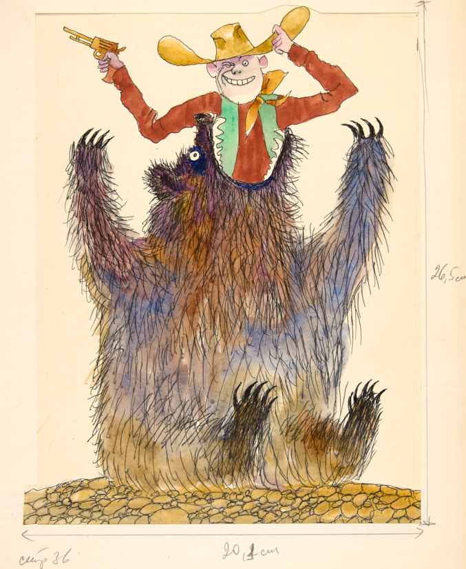 Ковбой и медведь. Оригинал иллюстрации для книги «Неуловимый ковбой. Американские стихи и сказки.» Для издательства «Монолог.» 1995 г. Бумага, тушь, перо, акварель, гуашь, 32×24,5 см.