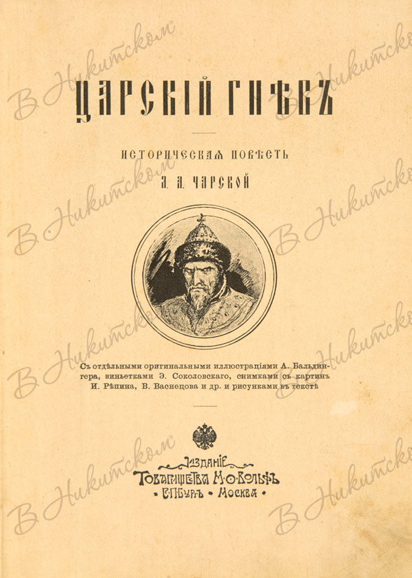 Чарская, Л.А. Царский гнев. Историческая повесть Л.А. Чарской. С отдельными оригинальными иллюстрациями А. Бальдингера, виньетками Э. Соколовского, снимками с картин И. Репина, В. Васнецова и др. и рисунками в тексте. СПб.; М.: Изд. Т-ва М.О. Вольф, [1909].