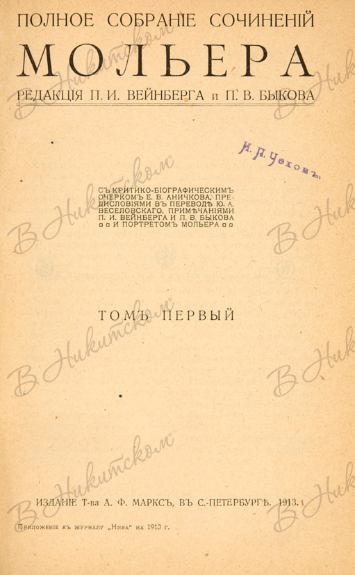 [Из библиотеки И.П. Чехова]. Мольер, Ж. Полное собрание сочинений Мольера. С критико-биографическим очерком Е.В. Аничкова, предисловиями в переводе Ю.А. Веселовского, примечаниями П.И. Вейнберга и П.В. Быкова и портретом Мольера / ред. П.И. Вейнберга, П.В. Быкова. В 4 т. [В 10 кн.]. Т. 1-2. СПб.: Изд. Т-ва А.Ф. Маркс, 1913.