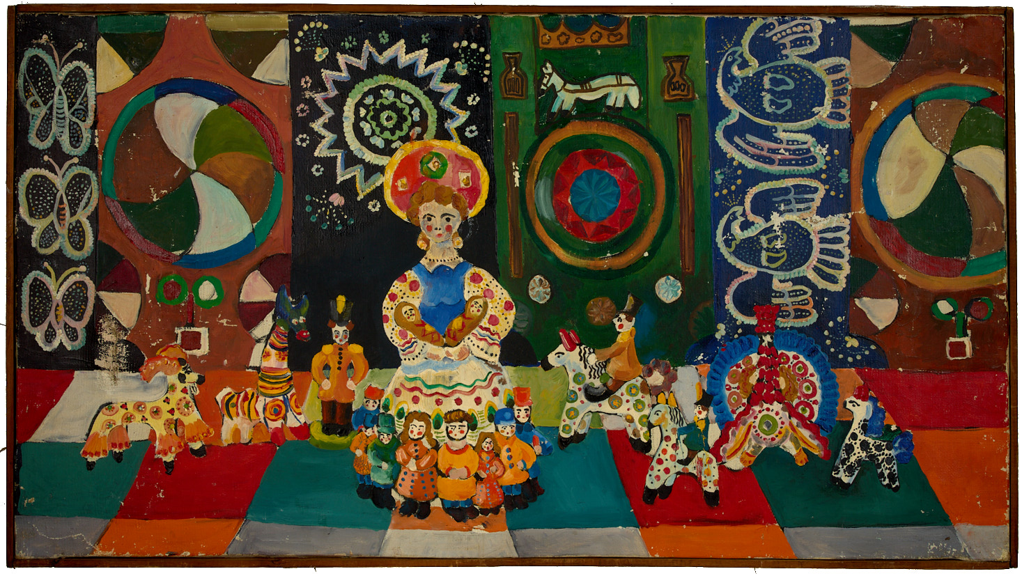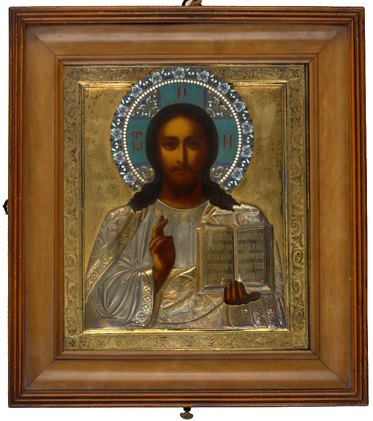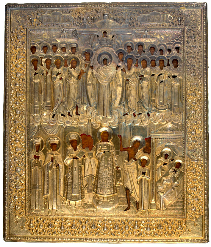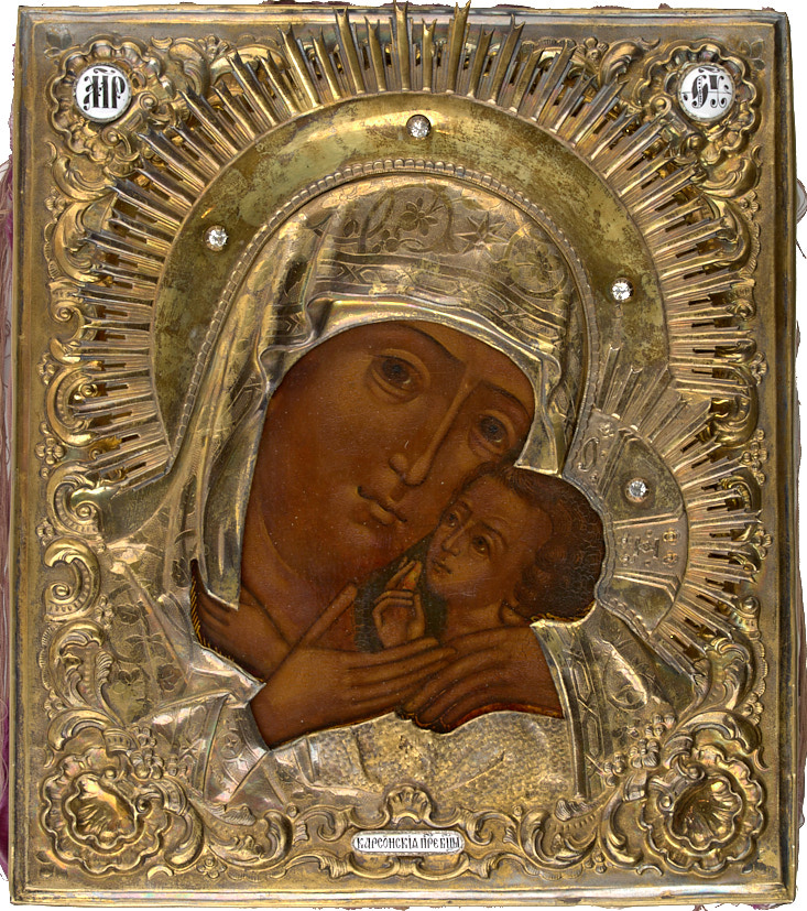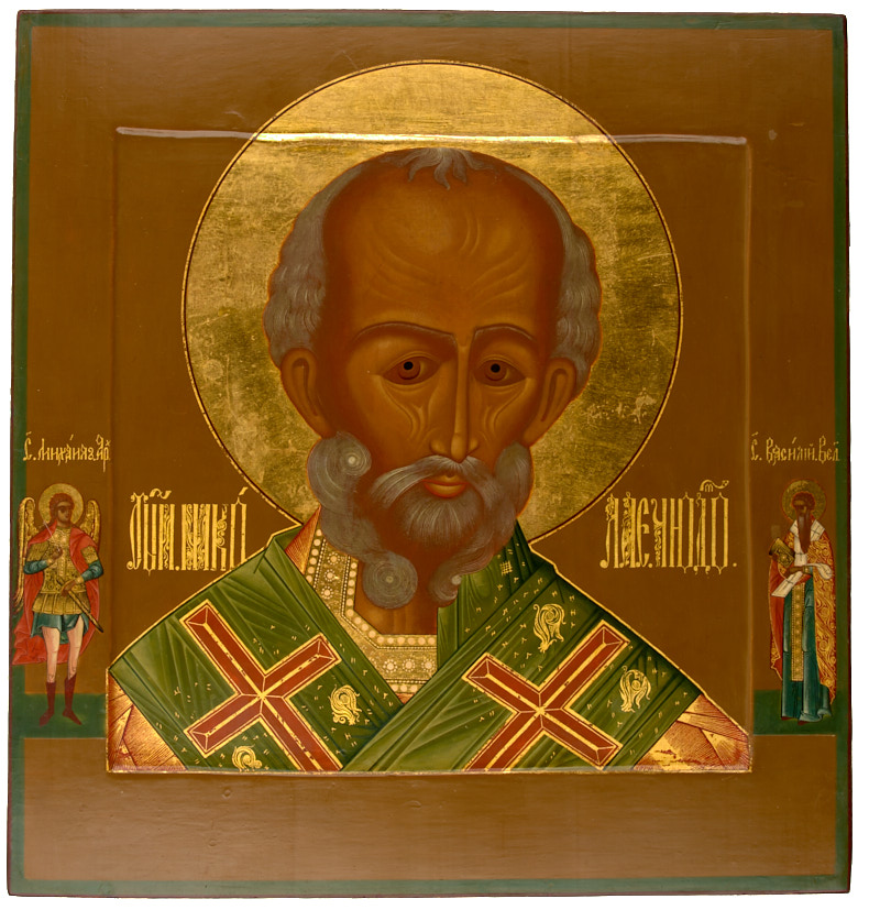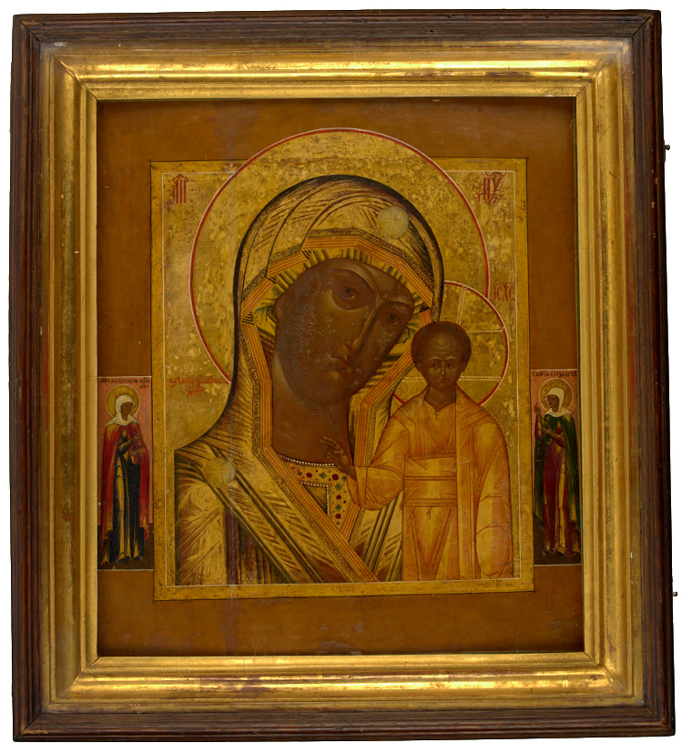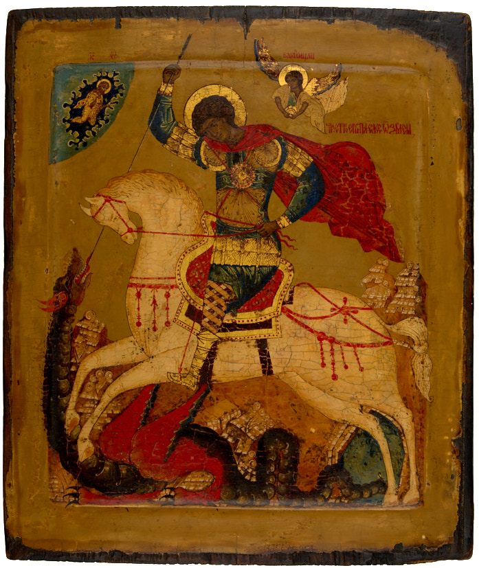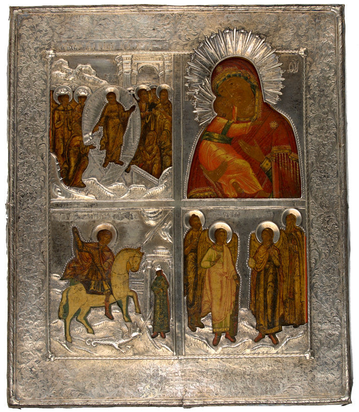 Икона четырехчастная: Воскресение Господне; Богоматерь Владимирская; Чудо Георгия о змие; Архангел Михаил, Ангел Хранитель, Иоанн Предтеча. Москва. Первая половина XIX в. Доска (кипарис), левкас, яичная темпера, 40,5×34×3 см.