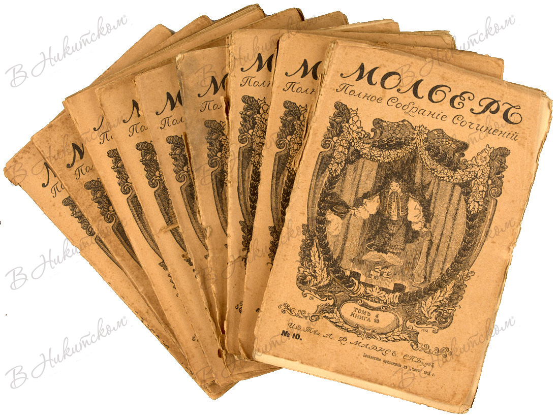 [Первое полное собрание сочинений на русском языке. Без одного тома]. Мольер. Полное собрание сочинений / Бесплатное приложение к журналу «Нива» на 1913. Под редакцией П.И. Вейнберга и П.В. Быкова, с критико-биографическим очерком Е.В. Аничкова, предисловиями в переводе Ю.А. Веселовского, примечаниями П.И. Вейнберга и П.В. Быкова и портретом Мольера. [В 10 т.]. Т. 1-5, 7-10. СПб.: Издание А.Ф. Маркс, 1913.