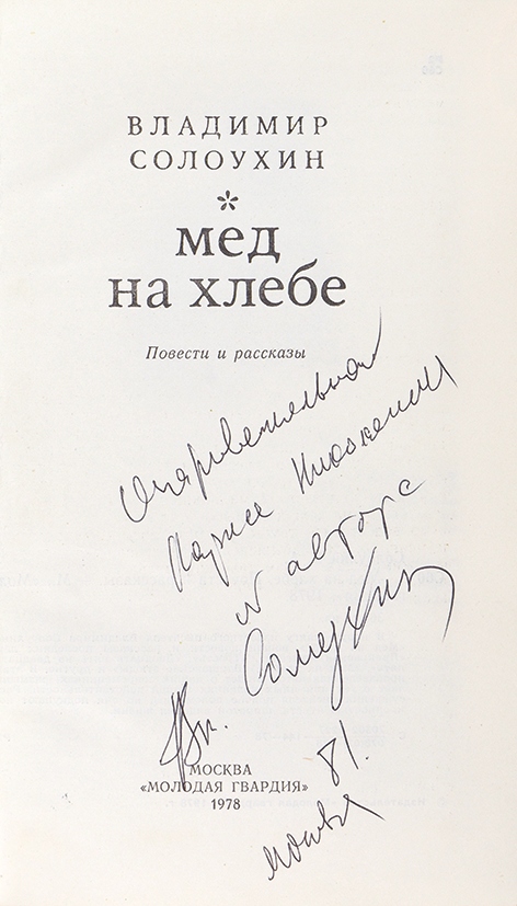 Солоухин, В. [Автограф]. Мед на хлебе. Повести и рассказы. М.: Молодая гвардия, 1978.