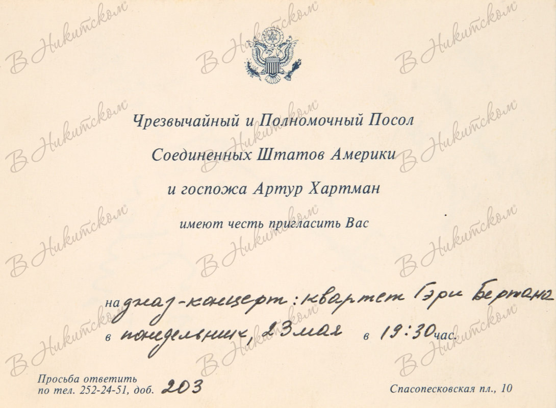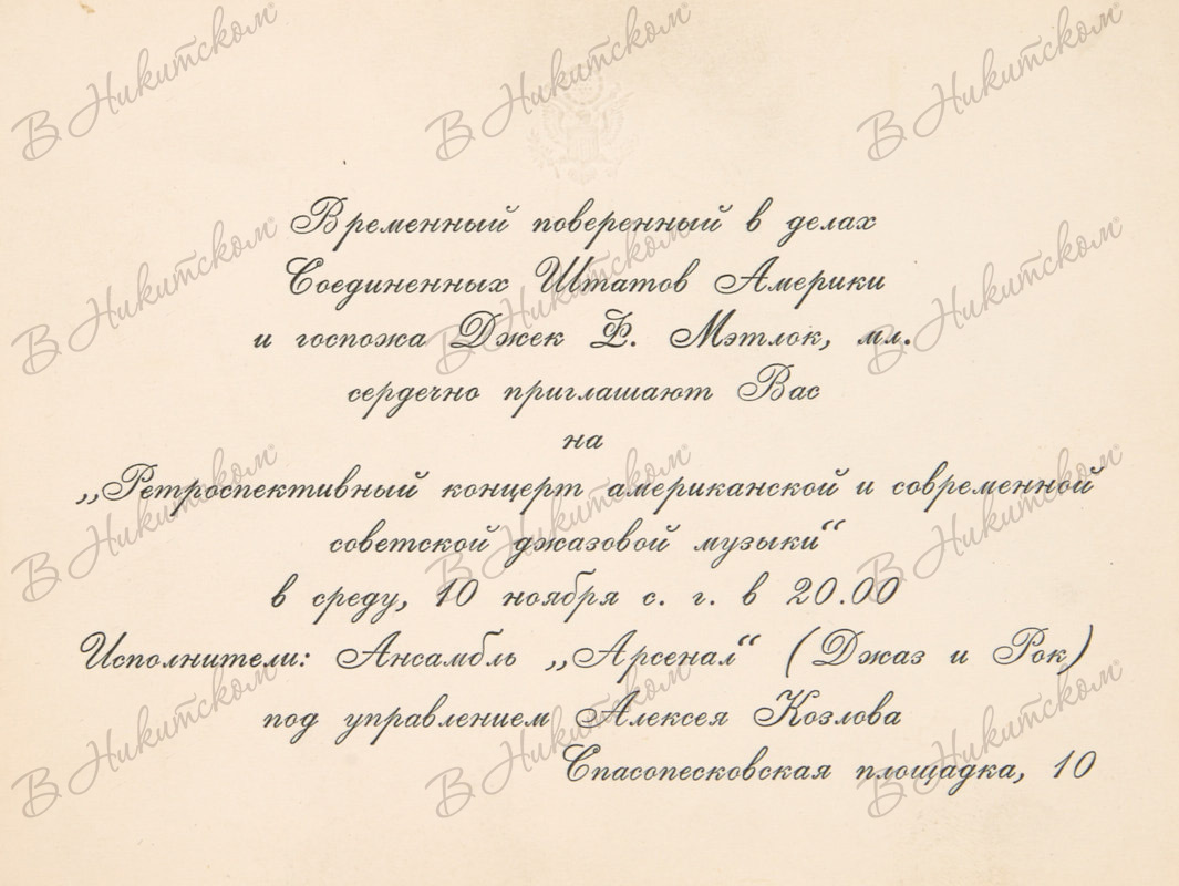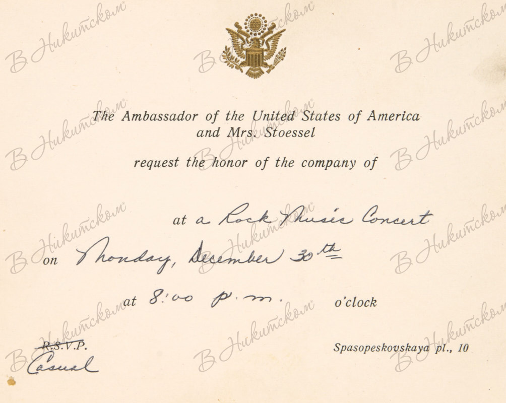 Лот из четырех приглашений на концерты от имени послов США в СССР: Уолтера Стессела, Артура Хартмана, Джэка Мэтлока. [1976-1991].