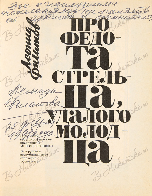 Филатов, Л. [Автограф]. Про Федота Стрельца, удалого молодца. Сказка для театра по мотивам русского фольклора. Минск, 1990.