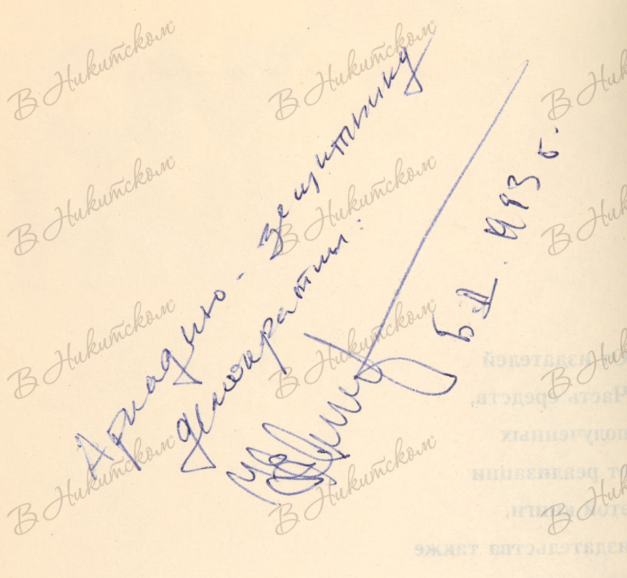 102, [6] с., ил., фотогр. 21,5 х 14,2 см. В иллюстрированной издательской обложке. На обороте авантитула автограф Б. Ельцина: «Аркадию - / защитнику / демократии. / (подпись) / Б.Д. 1993 г.».