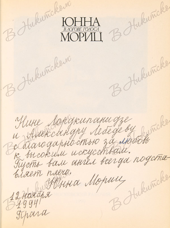 1 л. фронт., 397, [3] с. 17 х 13 см. В коленкоровом издательском переплете с золотым, цветным и блинтовым тиснением. В отличном состоянии. На обороте фронтисписа автограф автора: «Нине Лордкипанидзе / и Александру Лебедеву / с благодарностью за любовь / к высоким искусствам. / Пусть вам ангел всегда подста- / вляет плечо. / Юнна Мориц / 12 ноября / Прага».