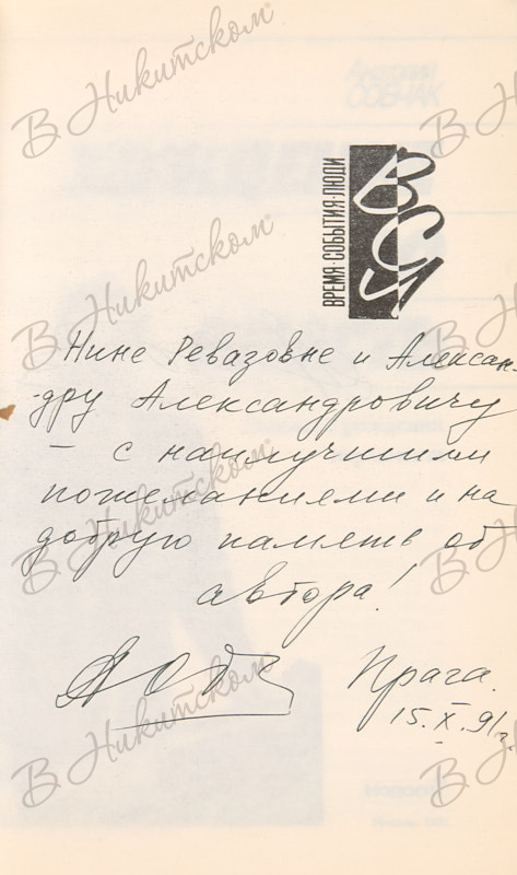 270, [2] с. 19,6 х 12,4 см. В иллюстрированной издательской обложке. На авантитуле дарственная надпись: «Нине Ревазовне и Алексан- / дру Александровичу - / с наилучшими пожеланиями и на / добрую память от / автора! / (роспись) Прага. / 15.X.91 г.».