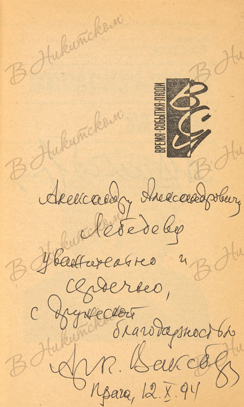 300, [2] с., ил. 20 х 12,5 см. В издательской обложке. Незначительные потертости обложки. На авантитуле автограф: «Александру Александровичу / Лебедеву / уважительно и / сердечно, / с дружеской благодарностью / Арк. Ваксберг / Прага, 12.Х.94».