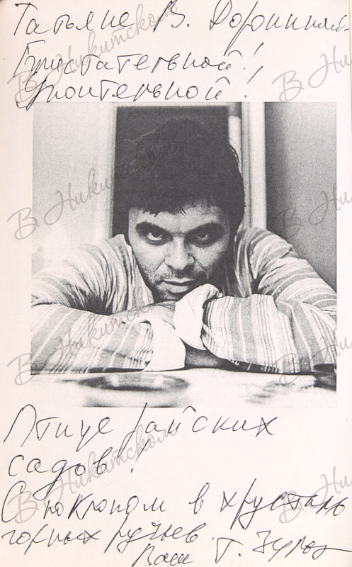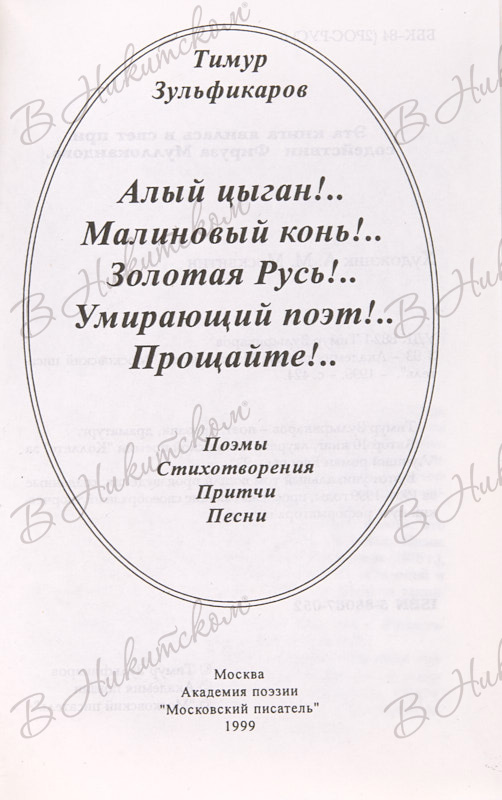 Зульфикаров, Т. [Автограф актрисе Т.В. Дорониной] Алый Цыган! Малиновый конь! Золотая Русь! Умирающий поэт! Прощайте! М.: «Московский писатель», 1999.