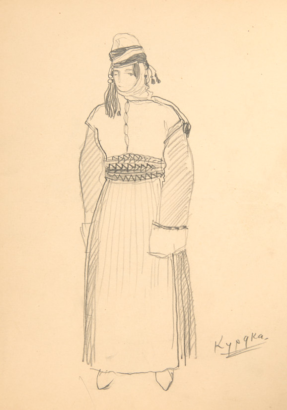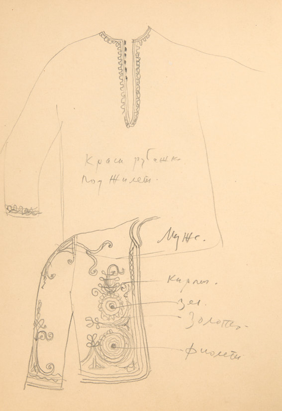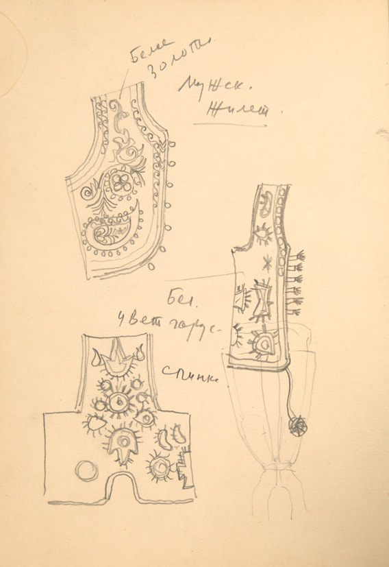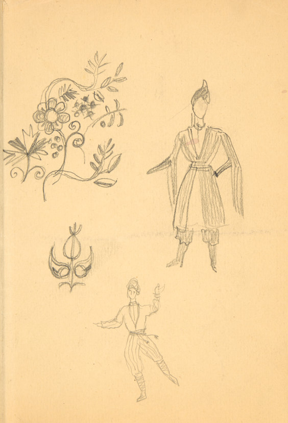 Лот из 21 листа эскизов костюмов и орнаментов к балету Хачатуряна «Гаянэ» для Кировского театра в Ленинграде. 1952 г. Акварельная бумага, карандаш, 20,5×14 см.