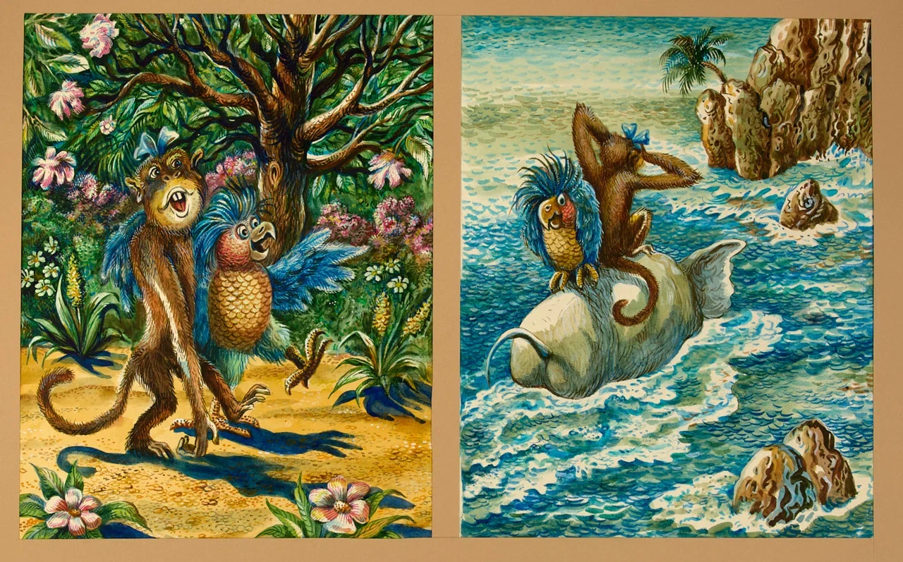 Обезьяна и попугай на море и на суше. Иллюстрация к книге «Обитаемый остров» Г. Остера. 1998 г. Бумага, аппликация, гуашь, 33×48 см.