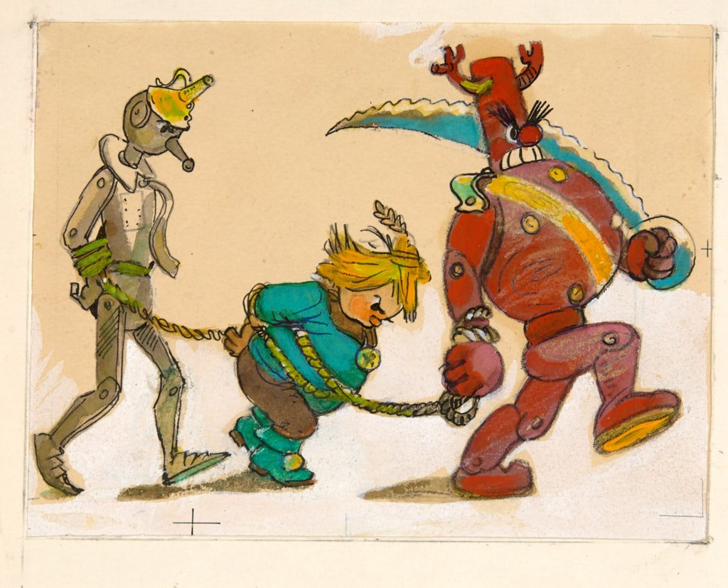 Плененные Страшила и Дровосек. Оригинал к книге «Урфин Джус и его деревянные солдаты». А.М. Волкова. 1970-е гг. Бумага, гуашь, 10,5×14 см.