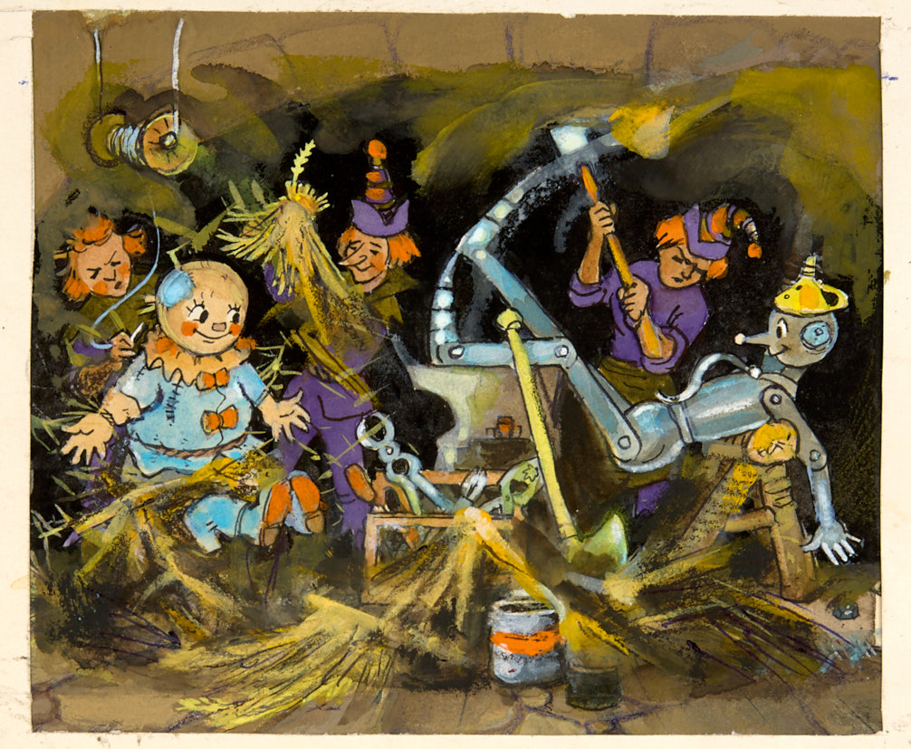 Ремонт Страшилы и Дровосека. Оригинал для книги «Золотой ключик». 1971 г. Бумага, гуашь, 12×13,5 см.
