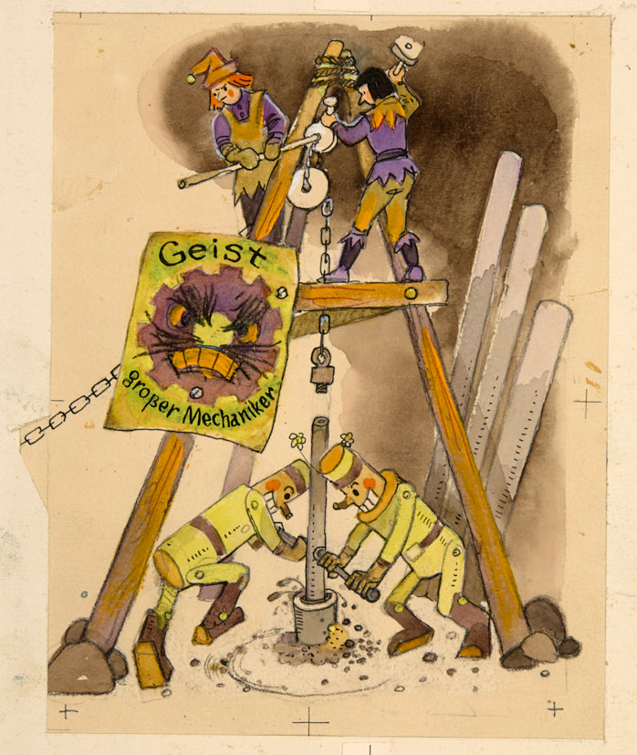 Рудокопы бурят источник Усыпительной воды. Оригинал для книги «Семь подземных королей» А.М. Волкова. 1970-е гг. Бумага, гуашь, 17×13 см.