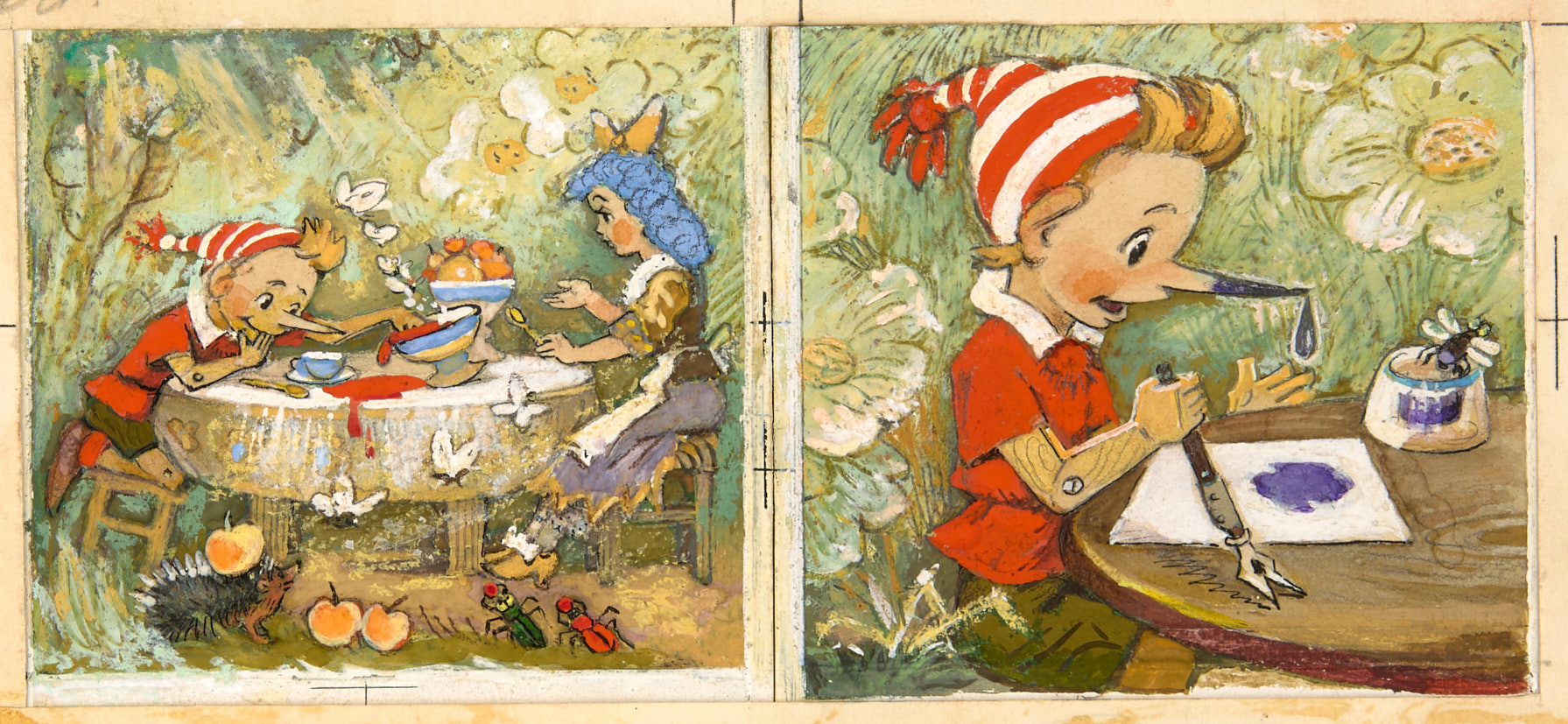 Лот из 2 оригиналов иллюстраций к сказке А. Толстого «Золотой ключик». 1971 г. 1. Мальвина угощает Буратино. 9×9 с.