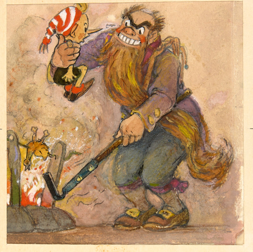 Карабас Барабас обещает бросить Буратино в очаг. 1971 г. Бумага, гуашь, тушь, 9*9 см.