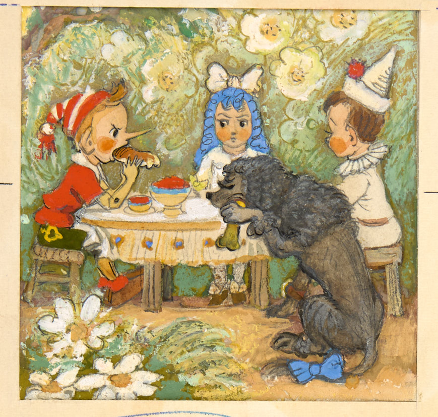 Буратино, Мальвина , Артемон, Пьеро за столом. 1971 г. Бумага, гуашь, тушь, 9*9 см.