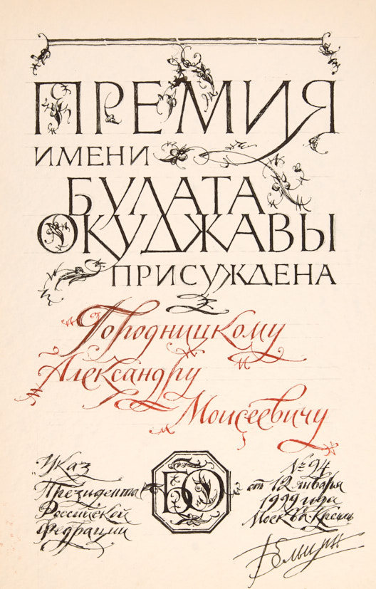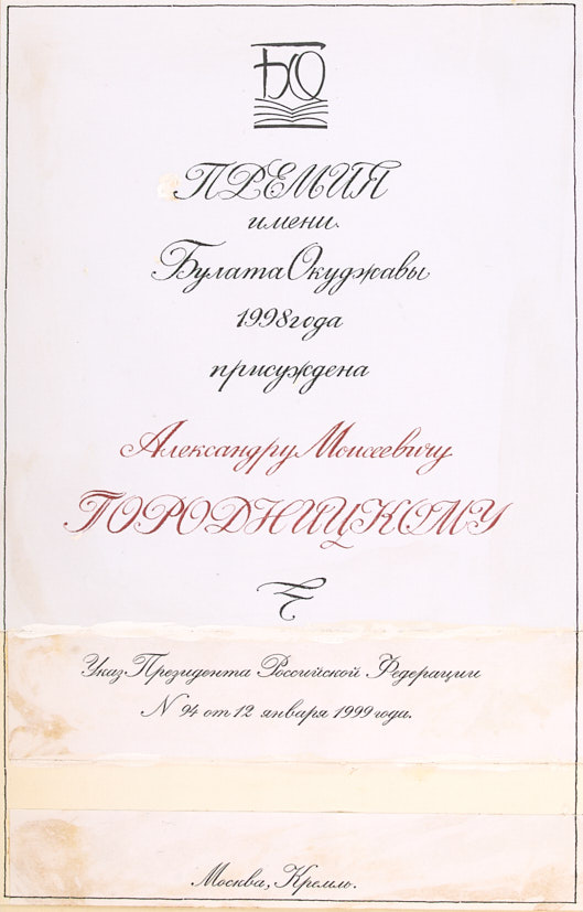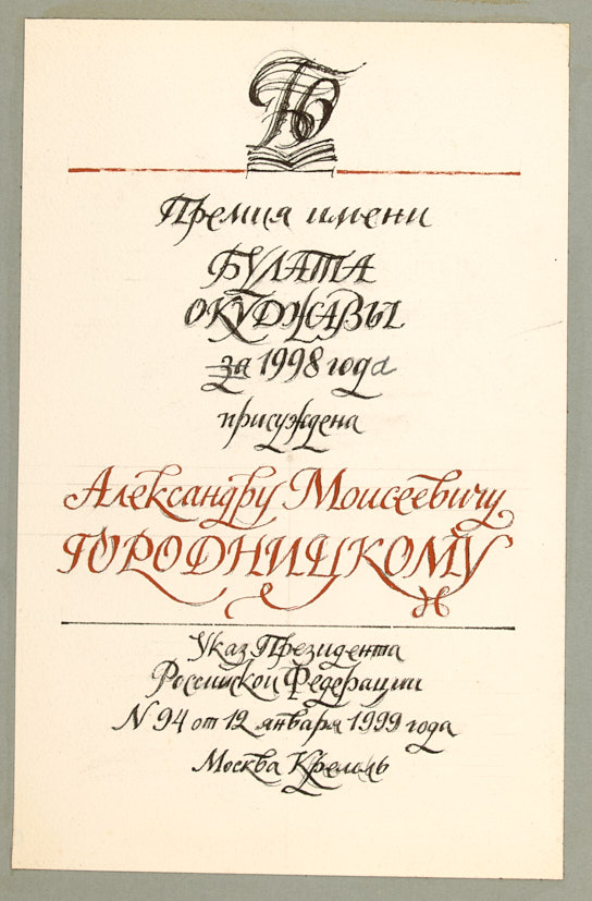Лот из 4-х вариантов диплома Премии имени Б. Окуджава в адрес Городницкого А. М. 1999 г. Бумага, тушь, перо, 35×22,7 см. В авторской папке.