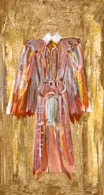 Лот из 3 эскизов костюмов к балету «Гамлет» (постановка Театра им. Палиашвили, балетмейстер Чабукиани). 1978 г. 1. Эскиз костюма принца. Ватман, тушь. перо, акварель, гуашь, белила, коллаж, 33,7×18,5 см.