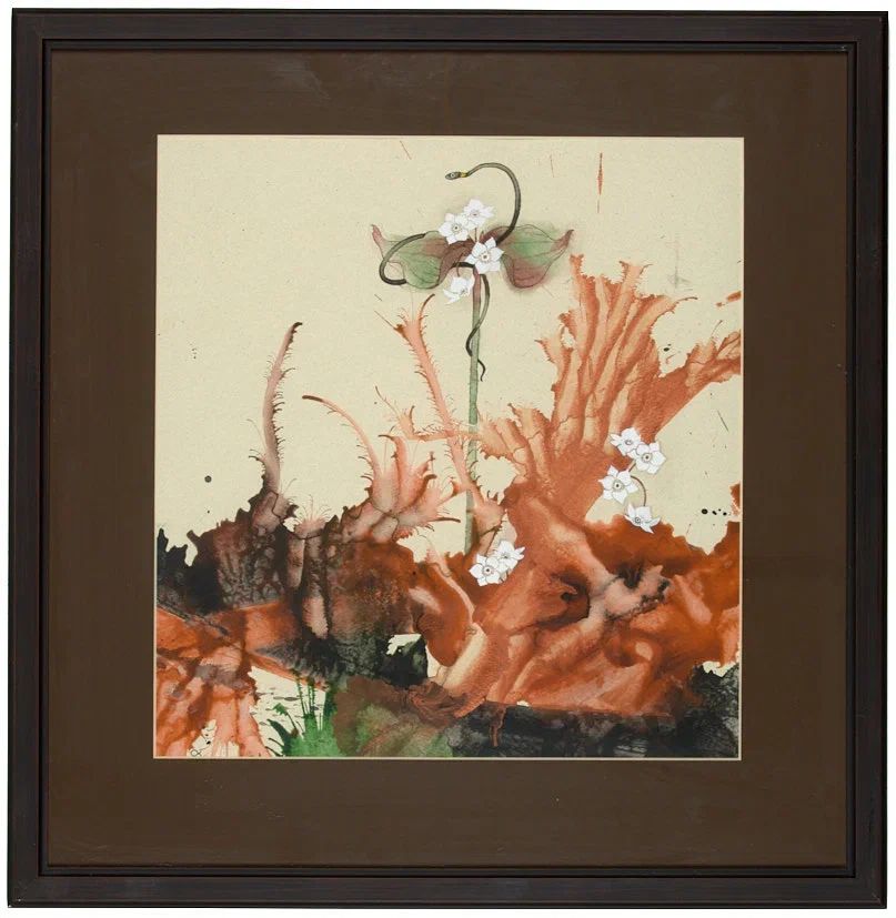 Абстракция с лилиями и ужом. 2000-е гг. Акварельная бумага, акварель, кисть, белила, тушь, перо, 45×43 см.