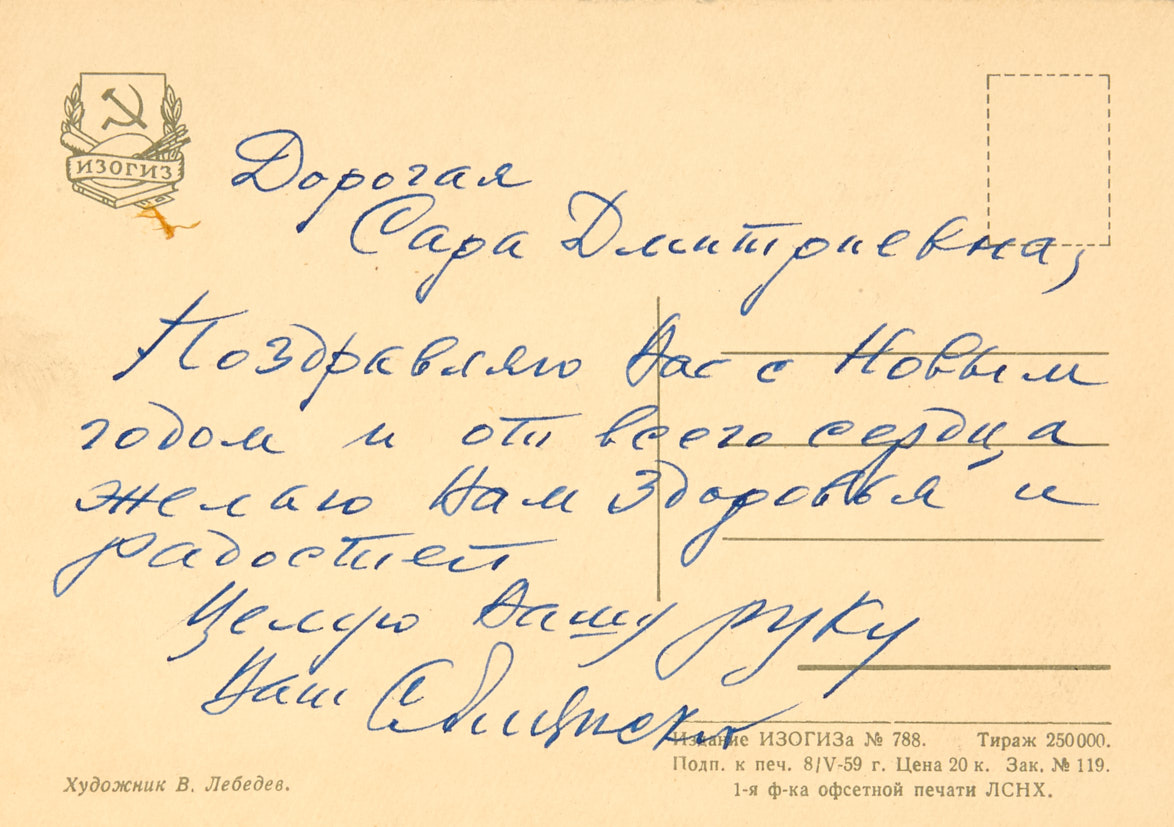 Алянский С. [Автограф] Открытка с поздравлением С. Алякринского в адрес скульптора Сарры Лебедева. 1959 г. На бланке открытки с воспроизведением рисунка В. Лебедева. 10,5×15 см.