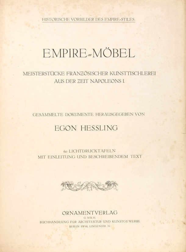 Хейслинг Эгон. Альбом ампирной мебели. Берлин [1890] 12 с. пояснений, 60 фототипий. 42×30,5.