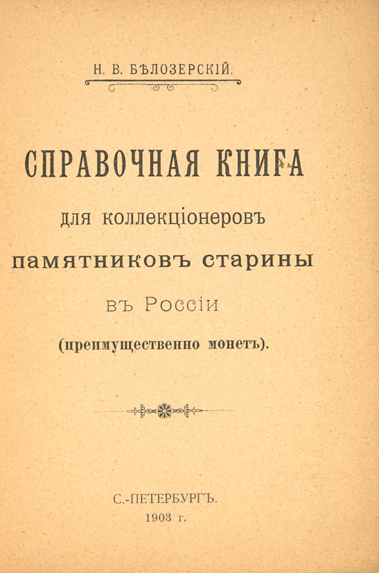 Справочная книга для коллекционеров памятников старины в России (преимущественно монет). СПб., 1903. 66 с.