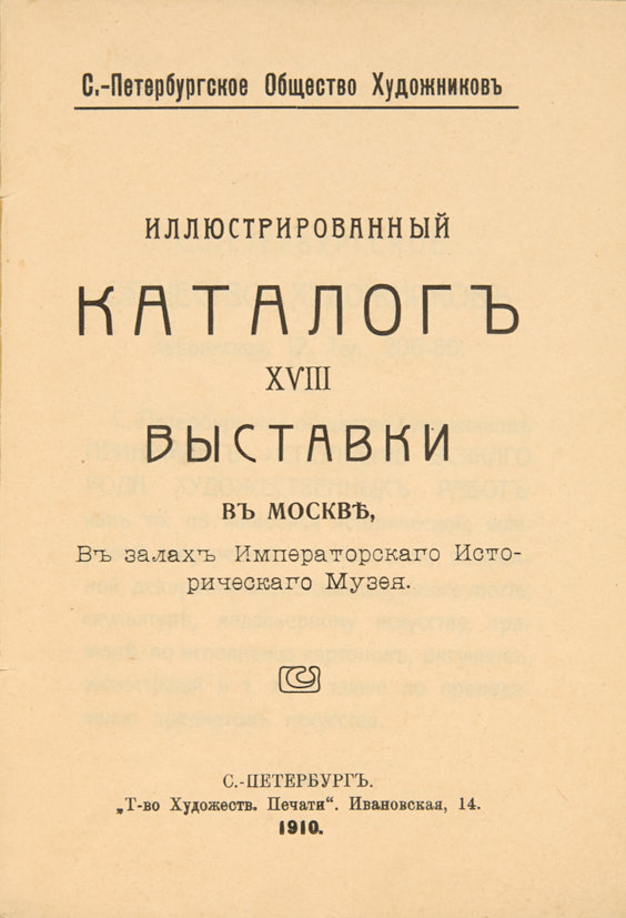 Иллюстрированный каталог XVIII выставки в С.-Петербурге. СПб.: Типография Т-ва Художественной печати, 1910. 36 с., 32 л. ил.