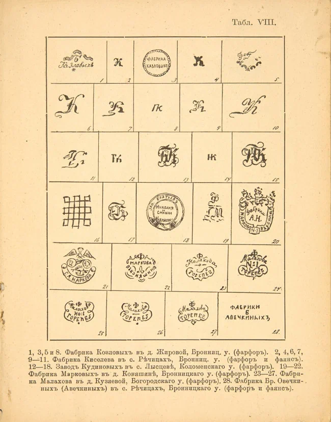 Фабричные марки на фарфоро-фаянсовых изделиях в России, быв. Царстве Польском и Финляндии. Рязань: Губернская типография, 1911. [4] 13 с., XXXVIII табл. на отд. листах, [4] с.