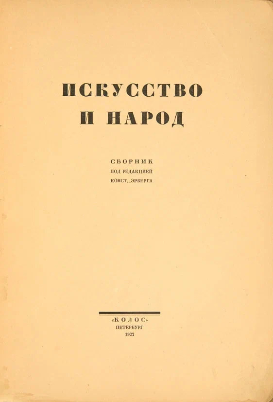 Искусство и народ. Сборник статей под редакцией Конст. Эрберга. / Обложка, марка, заставки и концовки работы К.С. Петрова-Водкина. М.: Колос, 1922. 230 с.
