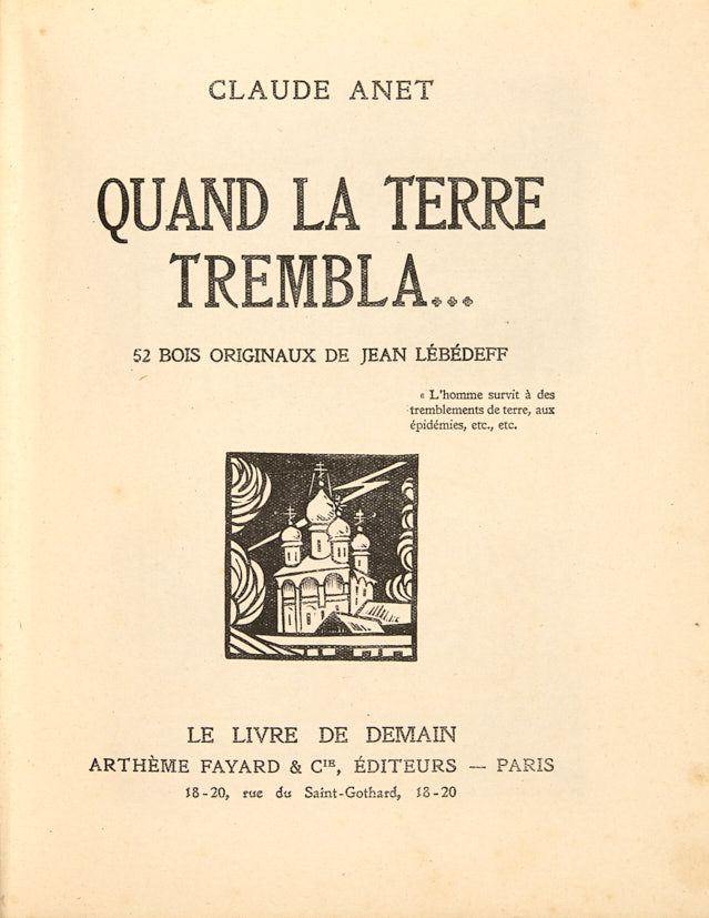 [Книга художника] Клод Анэ / Claude Anet. Когда земля сотрясалась / Quand la terre trembla. Линогравюры Жанна Лебедева. Париж: Arteheme Fayrd & C, 1926. 125 с., ил. 24×18.