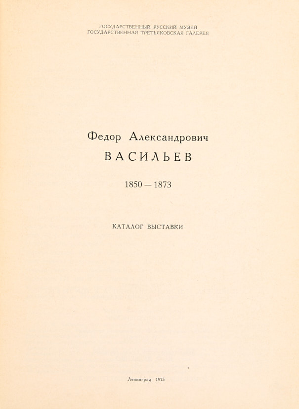 Федор Александрович Васильев 1850-1873: каталог выставки / Гос. Русский музей, Гос. Третьяковская галерея; [кат. сост.: Л. И. Иовлева и др.]. Л.: Художник РСФСР, 1975. 183 с.: ил.