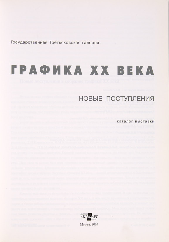 Лот из двух каталогов. 1. Графика XX века: Новые поступления: Каталог выставки / Гос. Третьяковск. галерея; Отв. ред. А.И.Морозов; Науч. ред.-Н.Л.Адаскина; Авт. вступ. ст. Е.В.Ефремова; Авт.-сост. кат.: Н.А.Белохвостова, Е.В.Ефремова. Москва : Аир-Арт, 2003. 86 с. ил.