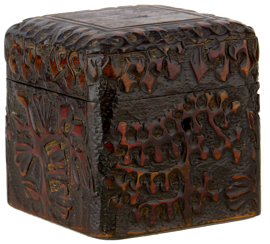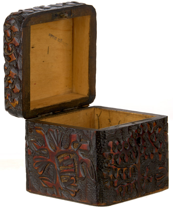 Шкатулка для рукоделья с сельским пейзажем на крышке. Сергиев Посад, мастерская В. Соколова. 1910-е гг. Дерево, резьба, выжигание, раскраска, 9×9×9 см.