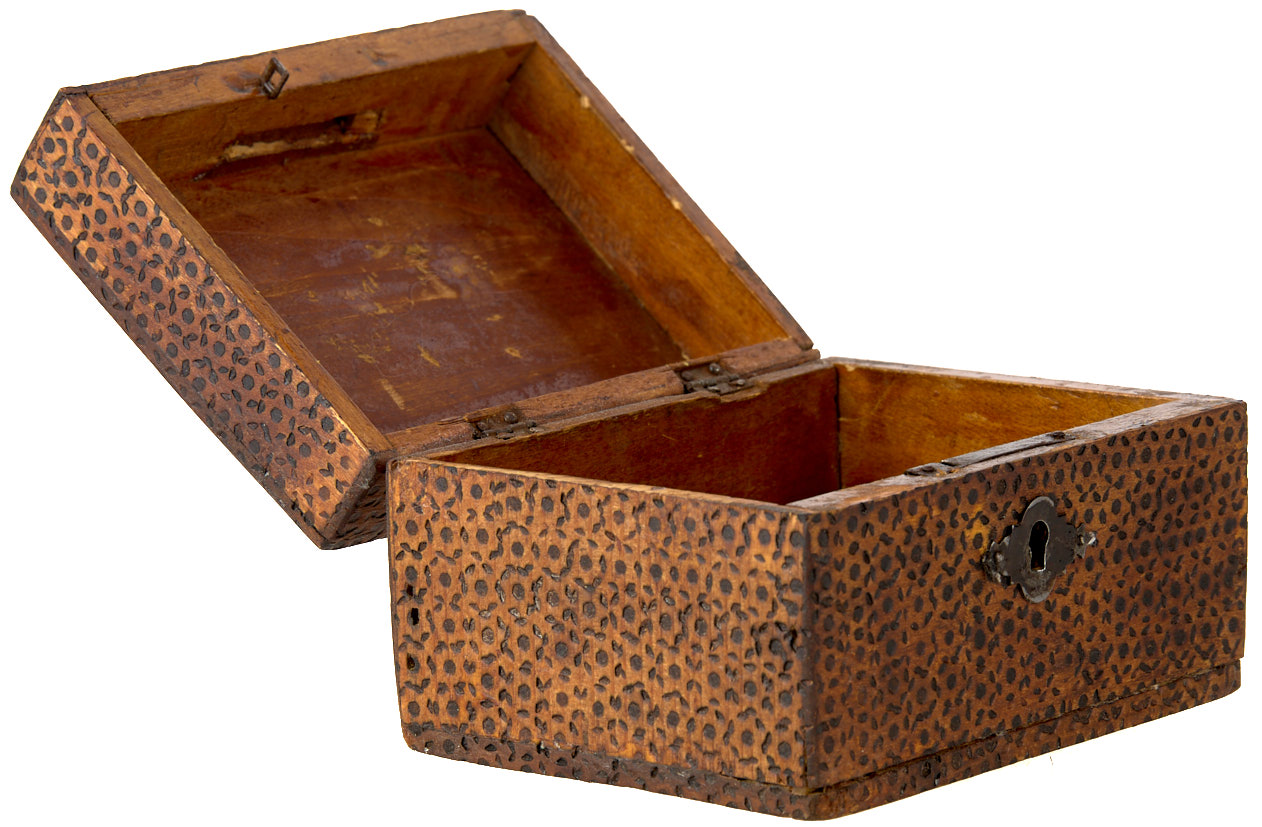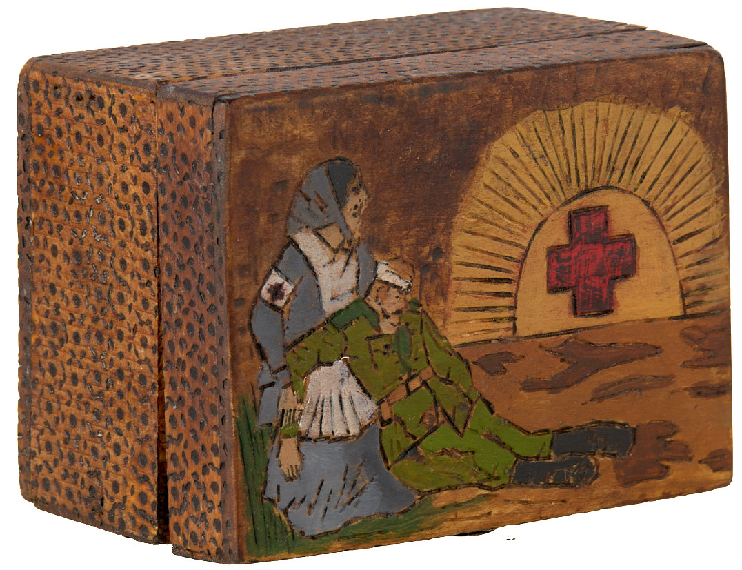 Шкатулка агитационная. Сестра Красного креста и раненый воин. Сергиев Посад, 1914-1917 гг. Дерево, резьба, выжигание, роспись, 7×8×12 см.