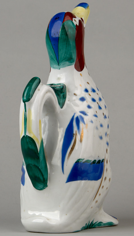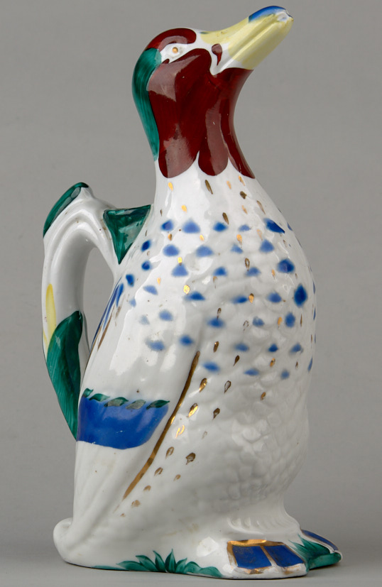 Кувшин в виде утки по модели Ризнич Ивана Ивановича (1908–1998). ЛФЗ. 1930-1940-е гг. Фарфор, подглазурная роспись, золочение, 23×10,5×7,5 см.