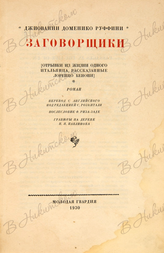 Руффини, Дж. Д. Заговорщики. Отрывки из жизни одного итальянца, рассказанные Лоренцо Белони. Роман / пер. с англ. под ред. С. Розенталя; послесловие Ф. Риза-Заде; гравюры на дереве П.Я. Павлинова; предисловие А. Дерман. Нижний Новгород: «Молодая гвардия», 1930.