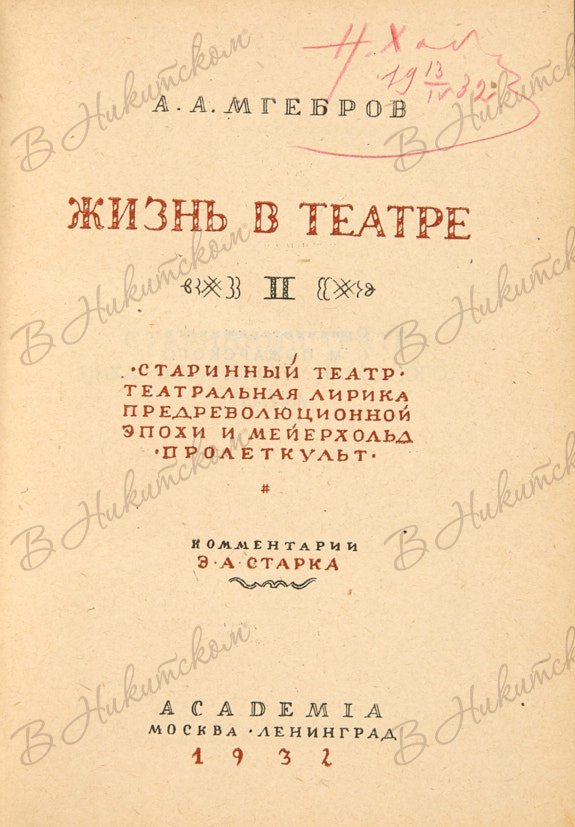 Мгебров, А.А. Жизнь в театре / оформ. С. Пожарского. [В 2 т.]. Т. 2. Л.: Academia, 1932.