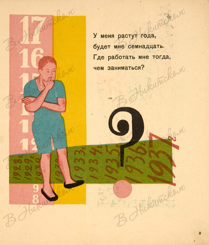 Иллюстрации к тексту Маяковского выполнил театральный художник Ниссон Абрамович Шифрин (1892-1961), который сумел показать производственную тематику сквозь призму карнавальной эстетики. В поисках своего призвания ребенок попадает то в столярный цех, то в паровозное депо, то в кабинет врача, то на палубу корабля. И на каждом развороте книги художник переодевает маленького героя в представителя той или иной профессии, вручает ему соответствующую производственную одежду и инструменты. Выполненные в авангардном стиле, в 1930-х гг. эти рисунки подверглись резкой критике: «Если выдумка здесь интересна, то выполнение значительно слабее. Нельзя давать ребятам фиолетово-розового дефективного мальчишку с тупой физиономией, раздумывающего над вопросом о выборе профессии; нельзя, переодевая этого мальчишку, например, в доктора или в инженера, давать ему облик, „бывший в употреблении“ лет 30-40 тому назад. Шарж в том виде, в каком он дан, здесь неуместен и неубедителен».