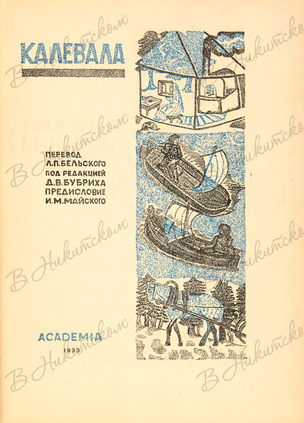Калевала / пер. Л.П. Бельского, под ред. Д.В. Бубриха, предисл. И.М. Майского. (Сокровища мировой литературы. Финский народный эпос). М.; Л.: Academia, 1933.