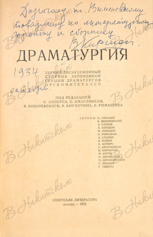 [Автограф писателя, сценариста и редактора В. Киршона писателю В. Вишневскому]. Драматургия. Первый дискуссионный сборник автономной секции драматургов Оргкомитета ССП / под редакцией: Б. Алперса, С. Амаглобели, В. Вишневского, В. Кирпотина, Б. Ромашова. М.: «Советская литература», 1933.