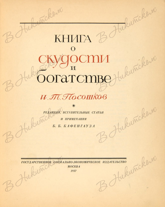 Посошков, И.Т. Книга о скудости и богатстве / ред., вступ. статьи и прим. Б. Б. Кафенгауза; худ. Н.В. Ильин. М.: Соцэкгиз, 1937.