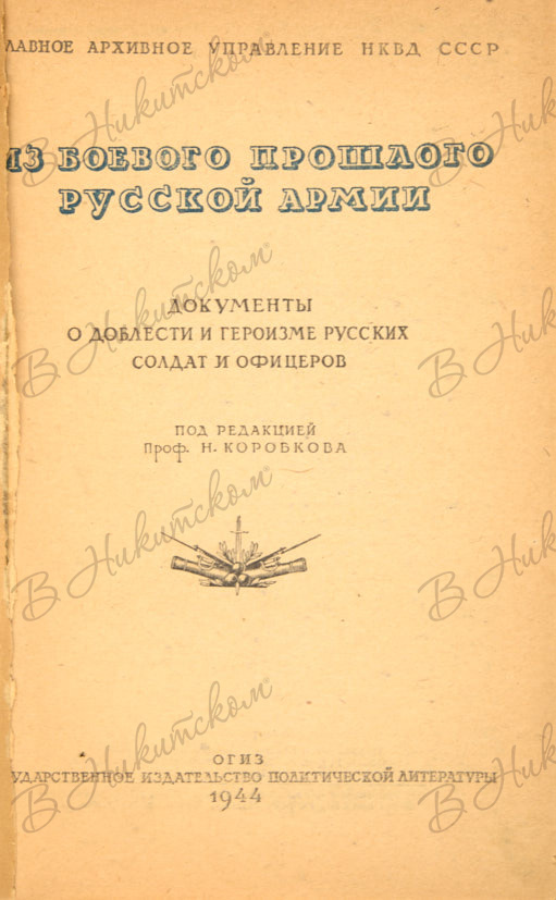 Из боевого прошлого русской армии. Документы о доблести и героизме русских солдат и офицеров / под ред. проф. Коробкова. [М.]: Госполитиздат, 1944.
