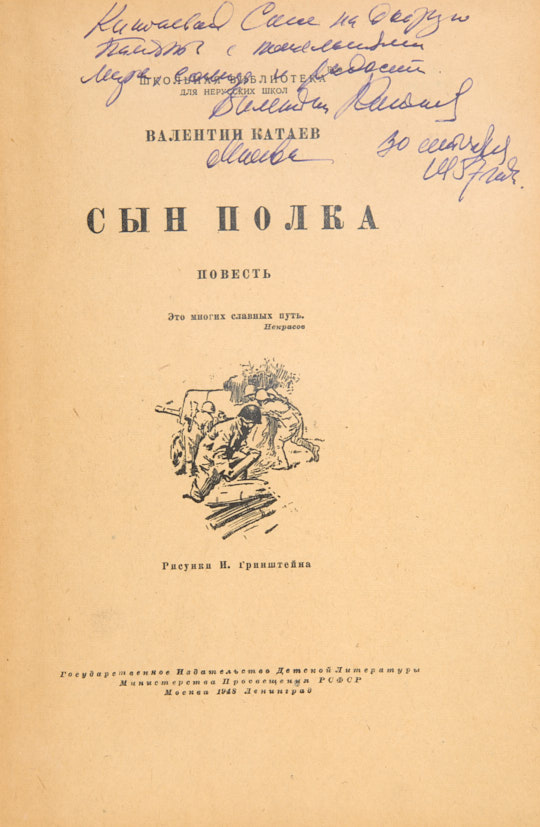 Катаев, В. [Автограф]. Сын полка. Повесть / рис. И. Гринштейна. М.; Л.: ДЕТГИЗ, 1948.