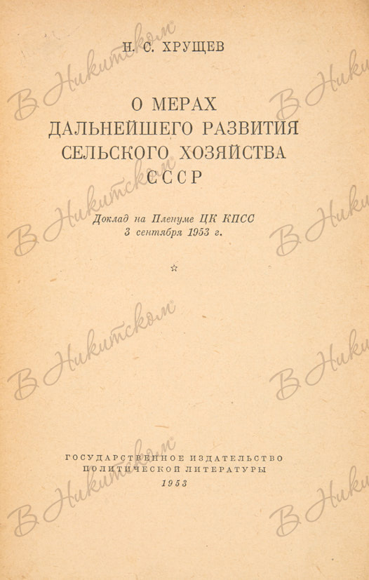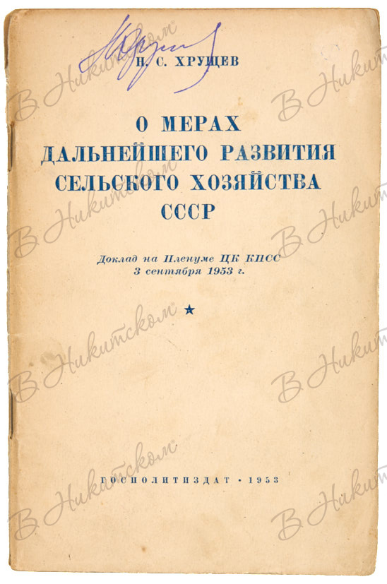 Хрущёв, Н.С. [Автограф]. О мерах развития сельского хозяйства СССР. Доклад на Пленуме ЦК КПСС 3 сентября 1953 г. Л.: ГОСПОЛИТИЗДАТ, 1953.