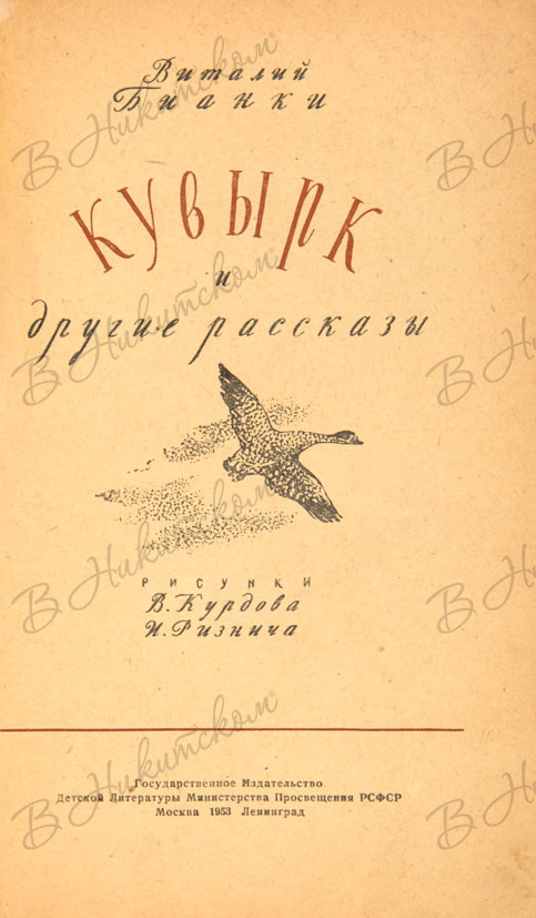 Бианки, В. [Автограф]. Кувырк и другие рассказы / рисунки В. Курдова и И. Ризнича. М.; Л.: ДЕТГИЗ, 1953.