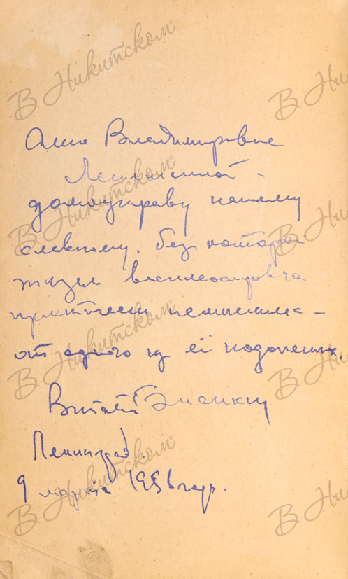 238, [2] с. 20,5 х 13,5 см. В картонажном издательском иллюстрированном переплете, тканевый корешок. Потертости переплета и корешка, утрата фрагментов бумаги на крышках. Надрывы средних полей с. 49-56, небольшие загрязнения в блоке. На обороте форзаца 2а автограф автора: «Анне Владимировне / Ле[нрзб] - / домоуправу нашему / славному, без которой / жизнь василеостров[нрзб] / немыслима - / от одного из её подопечных. / Виталий Бианки / Ленинград. / 9 марта 1956 года.».