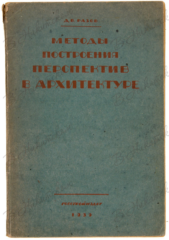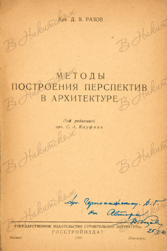 2. Разов, Д. [Автограф] Методы построения перспектив в архитектуре. М.; Л.: Госстройиздат, 1939. 124 с., ил. 22 х 15 см. В издательской обложке. Утрата фрагмента корешка. На титульном листе автограф: «Арх. Чернопыжскому Д.Г. от автора Д. Разов».