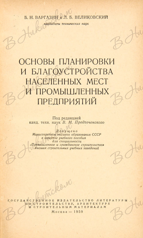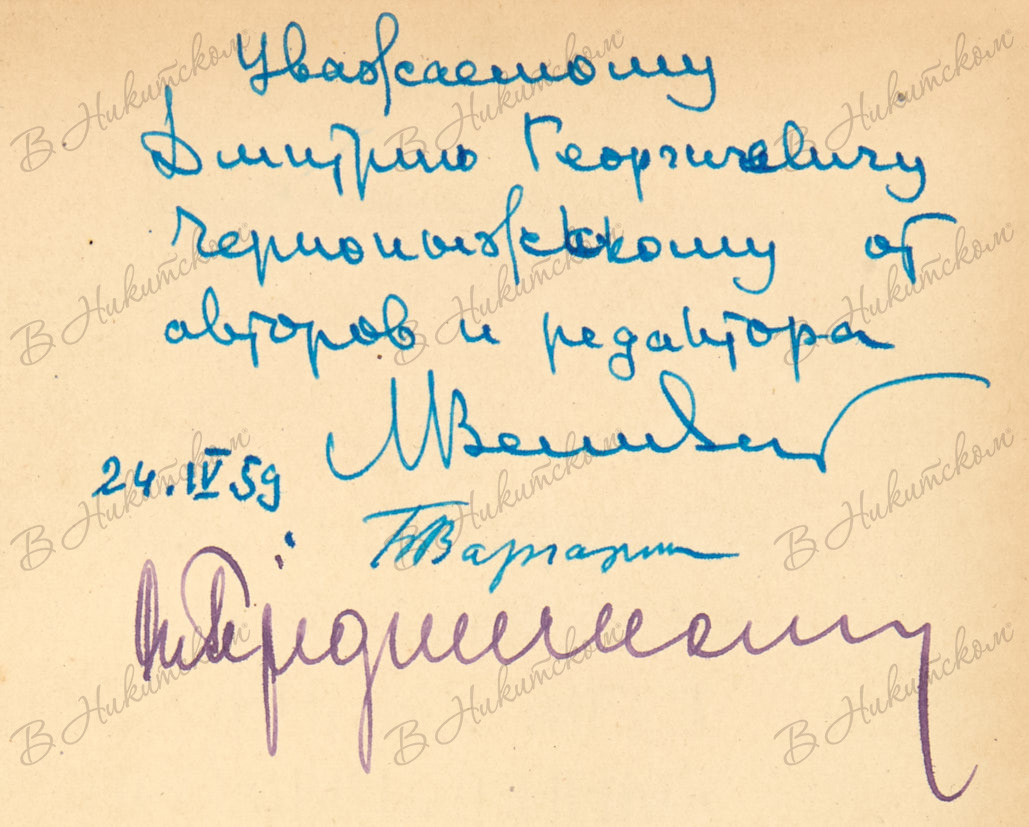 3. Варагзин, Б., Великовский, Л. [Автографы] Основы планировки и благоустройства населенных мест и промышленных предприятий / под ред. В. Предтеченского [Автограф]. М.: Госстройиздат, 1959. 231 с., ил. 23,1 х 15 см. В издательской обложке. На форзаце автограф: «Уважаемому Дмитрию Георгиевичу Чернопыжскому от авторов и редактора. Л. Великовский Б. Варагзин В. Предтеченский».