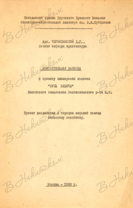 1. Чернопыжский, Д. Пояснительная записка к проекту планировки колхоза «Путь Ильича» Кашинского сельсовета Волоколамского р-на М. О. М., 1955. 8, [1], 3, 2, [5] с., ил. 29,4 x 21,3 см. В обложке. Небольшие потертости, загрязнения.